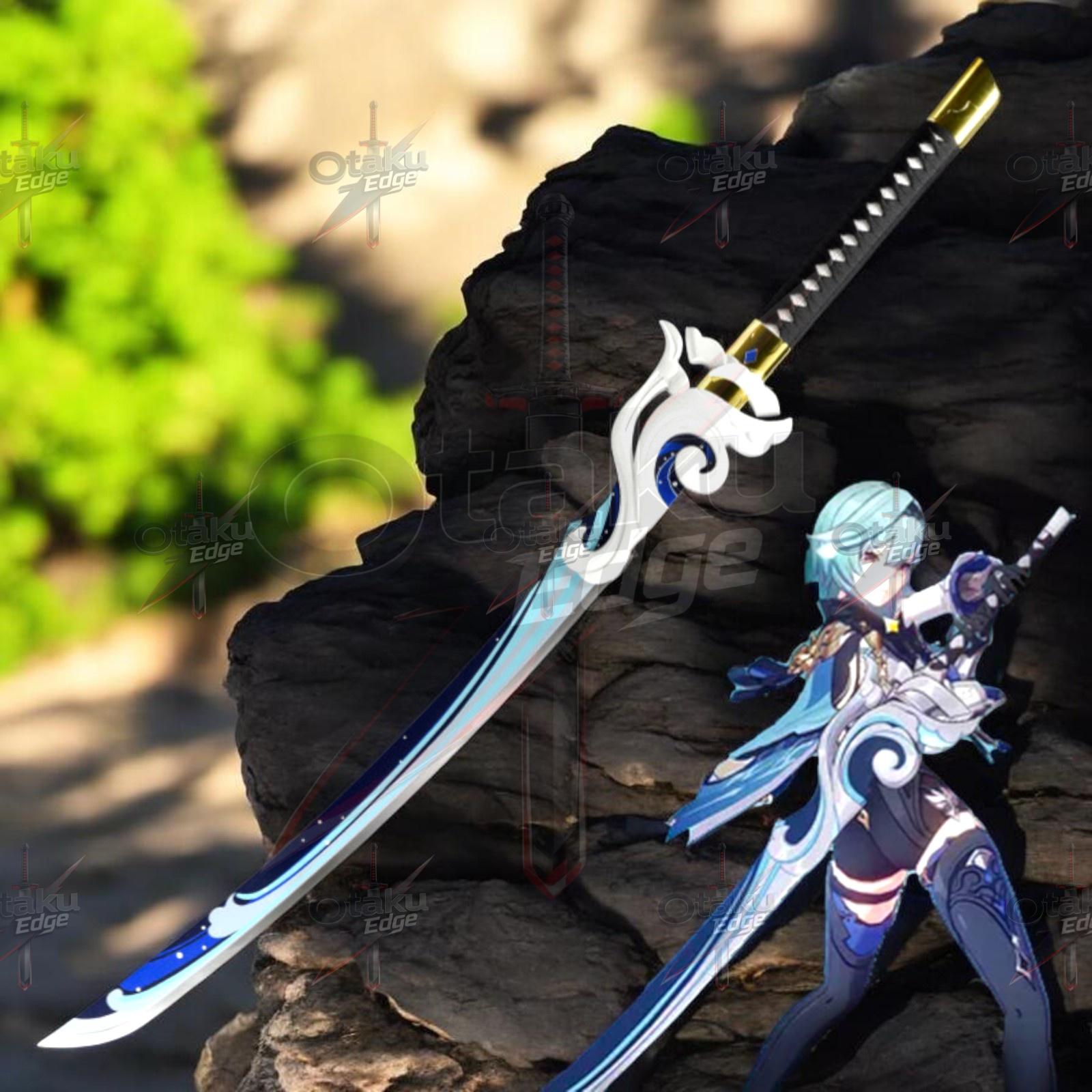 Life-size metal claymore replica of Akuoumaru from Genshin Impact. Engraved violet finish, on-screen scale.