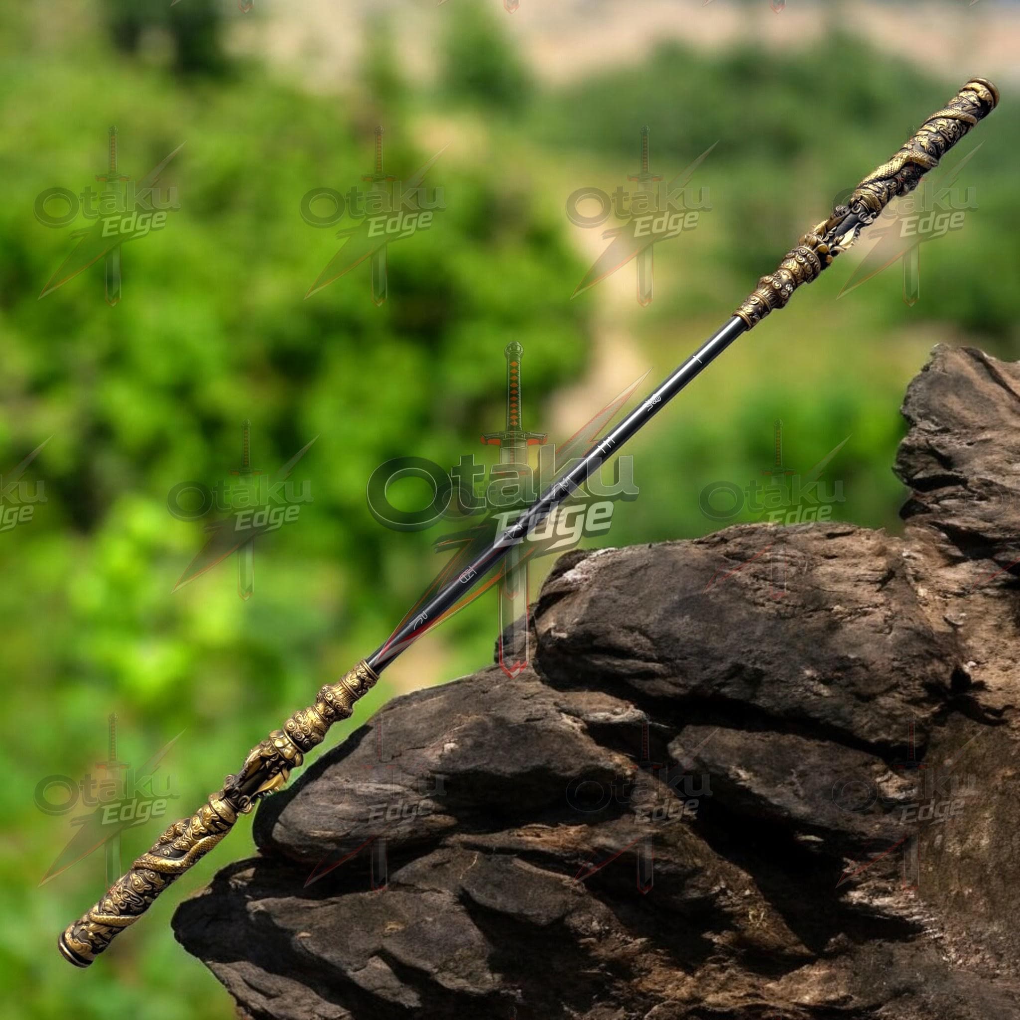 Ruyi Jingu Bang — the 'As-You-Will Gold-Banded Staff' — is Sun Wukong's weapon in Journey to the West and Black Myth: Wukong. Lore says it can shrink to the size of a needle and grow to pillar the heavens. This replica captures the game's exact golden-band motif and carved finial. The 2-piece design makes it shippable and storable without sacrificing display length.