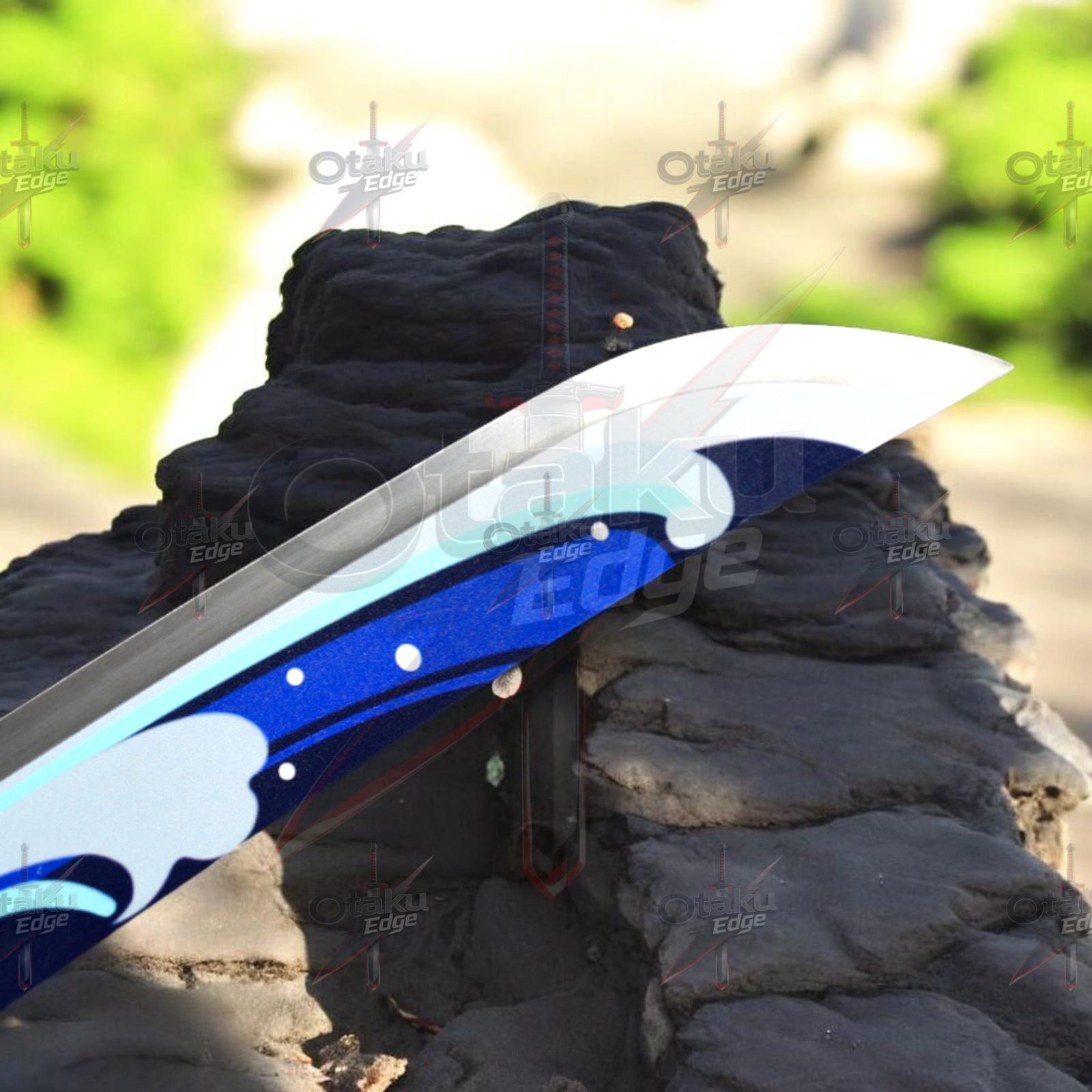 Life-size metal claymore replica of Akuoumaru from Genshin Impact. Engraved violet finish, on-screen scale.