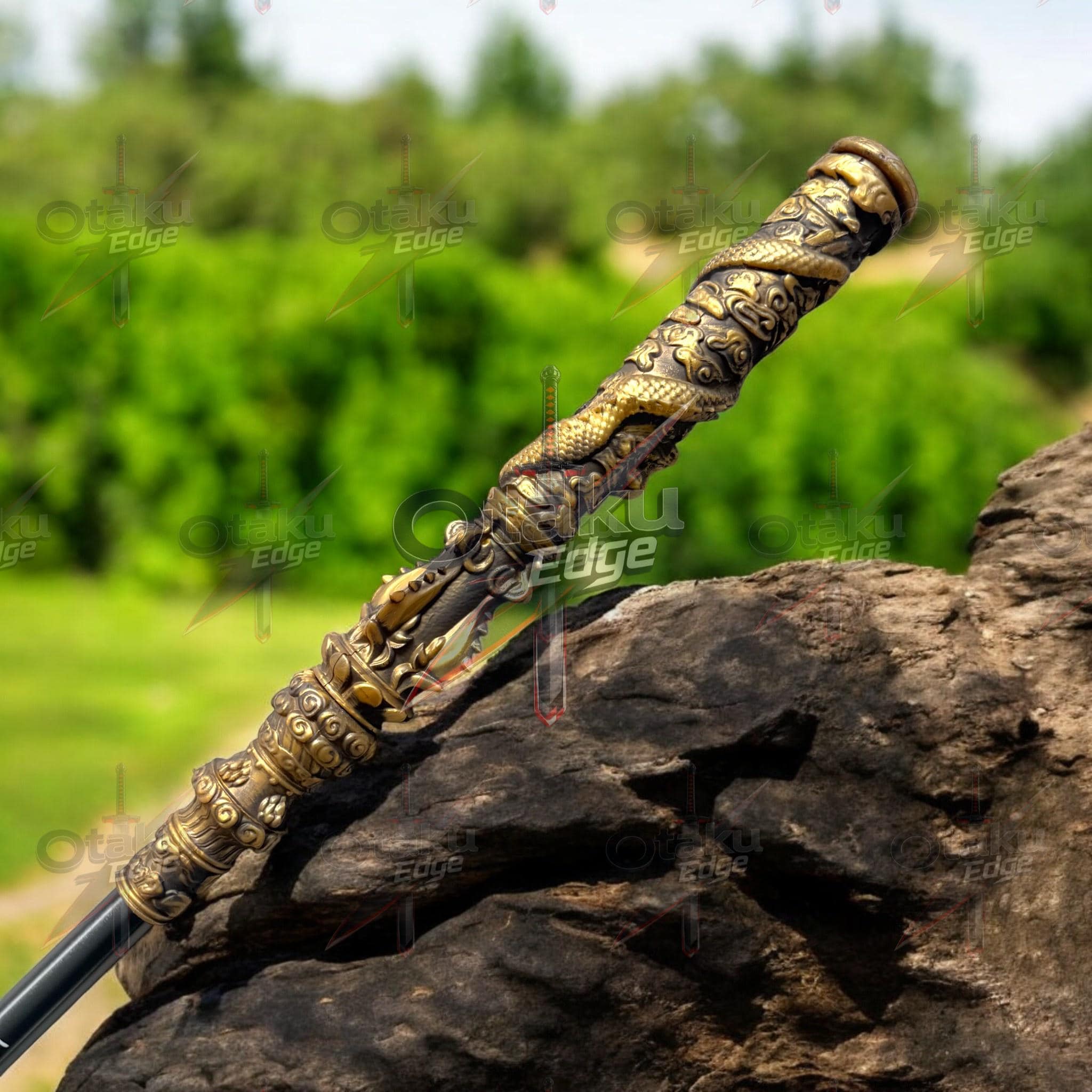 Ruyi Jingu Bang — the 'As-You-Will Gold-Banded Staff' — is Sun Wukong's weapon in Journey to the West and Black Myth: Wukong. Lore says it can shrink to the size of a needle and grow to pillar the heavens. This replica captures the game's exact golden-band motif and carved finial. The 2-piece design makes it shippable and storable without sacrificing display length.